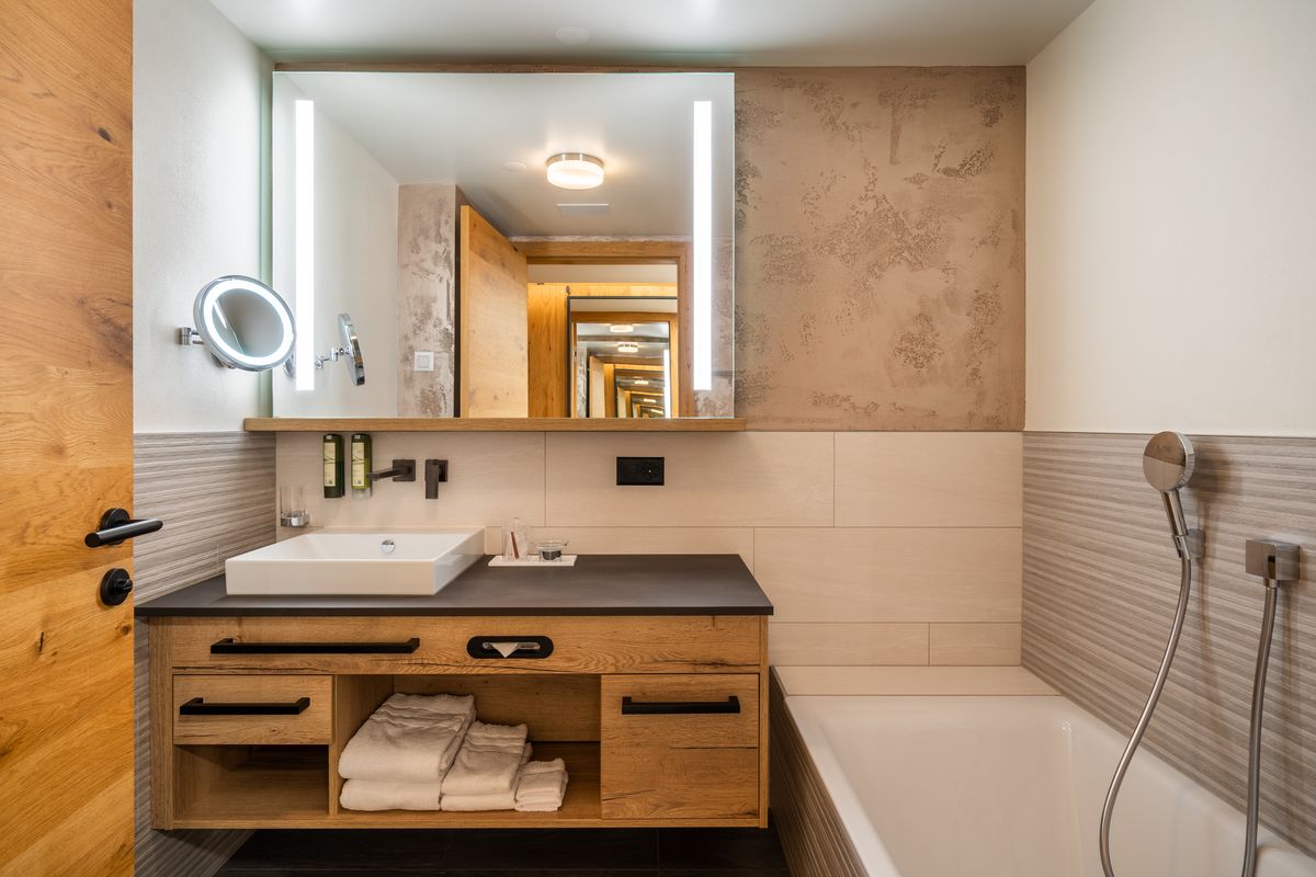 Kosmetikspiegel, Handtuchwärmer, Haarföhn, Telefon, Radio, Minibar und Safe
