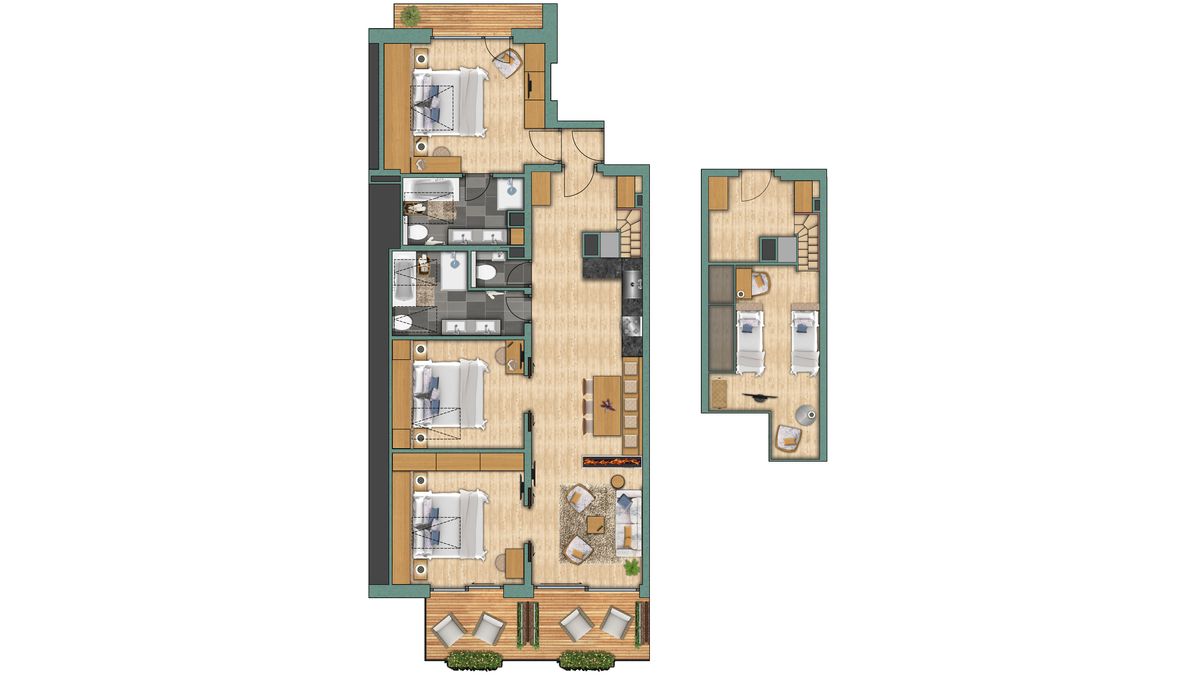 Wie der Name schon sagt, ist die Aussicht Programm. Nicht nur Blick aufs Matterhorn - in diesem Appartement sind sie über den Dächern von Zermatt und geniessen einen Ausblick auf das ganze Dorf. Das Appartement "Zinalrothorn" View ist im modernen, alpinen Stil eingerichtet und befindet sich im vierten Stock des Altiana by La Ginabelle. Es besteht aus zwei Einheiten mit Verbindungstüre. Das Highlight des Attika-Appartements ist neben der Aussicht, die hohe Decke, sowie die 5m hohe, bodenbündige Fensterfront Richtung Süden.