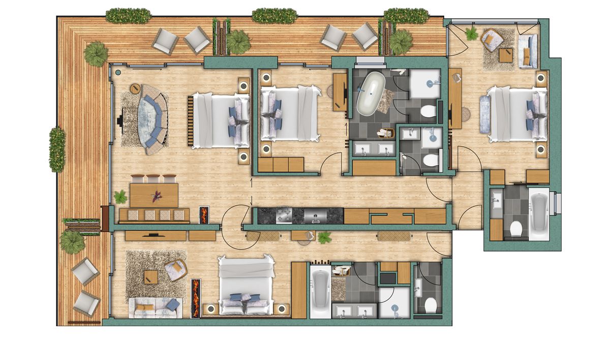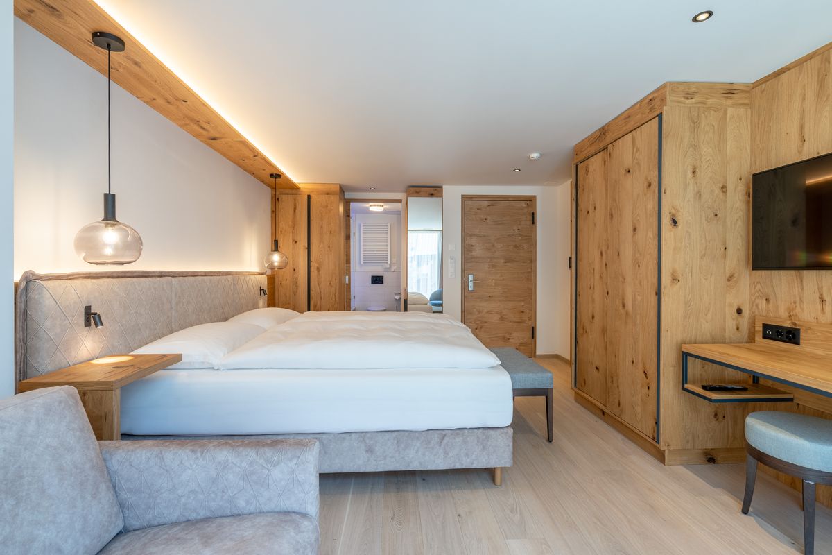 Das Appartement "Matterhorn" Komfort ist im modernen, alpinen Stil eingerichtet und befindet sich im ersten Stock des Altiana by La Ginabelle. Es besteht aus drei Einheiten mit Verbindungstüre. Das Highlight des Eck-Appartements ist die bodenbündige Fensterfront, welche sich 8m lang in Richtung Süden und Westen erstreckt – viel Tageslicht ist garantiert, so wie eine freie Sicht auf das Matterhorn.