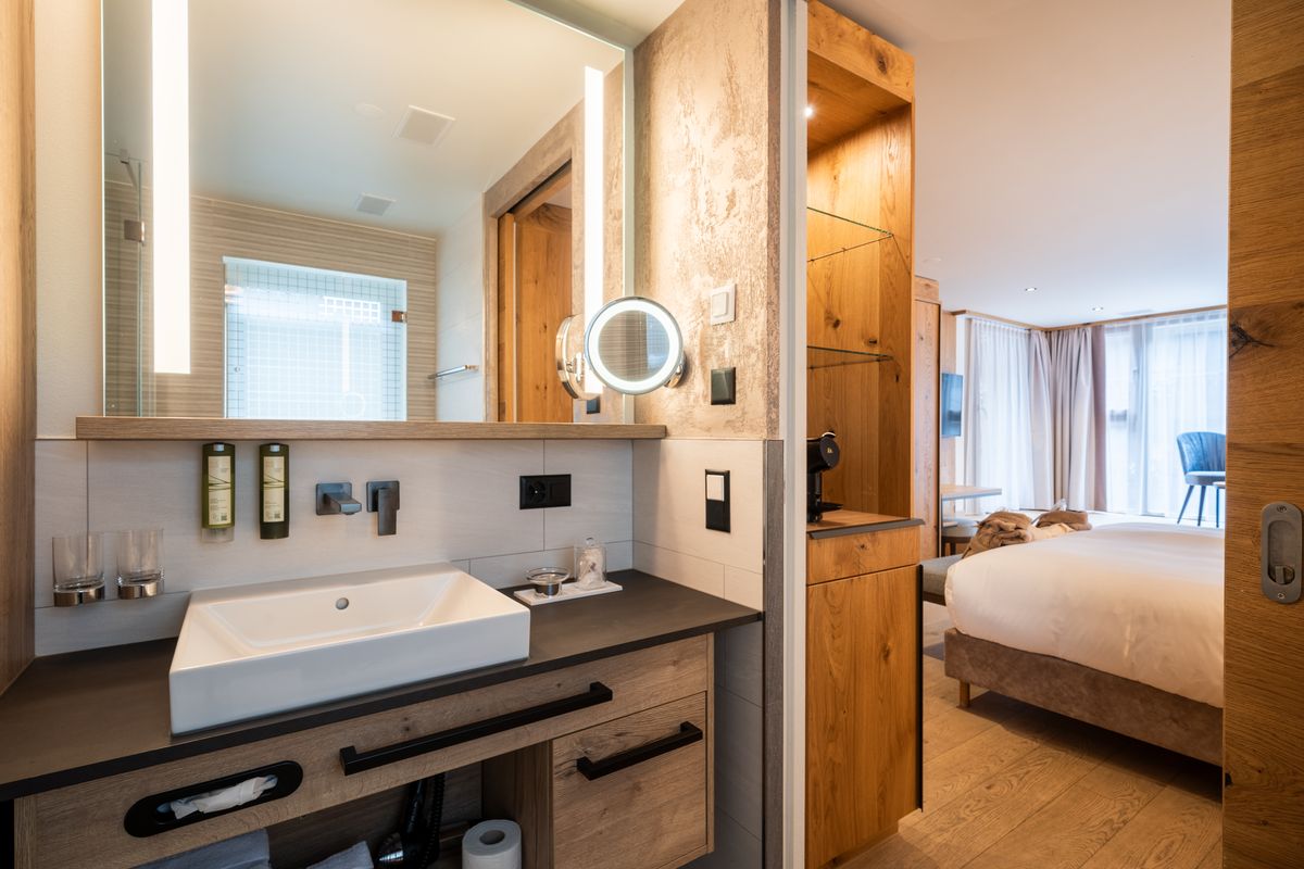 Kosmetikspiegel, Handtuchwärmer, Haarföhn, Telefon, Radio, Minibar und Safe