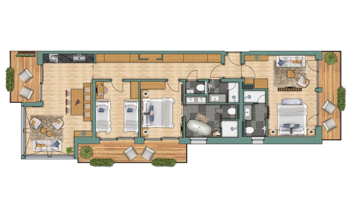 Das Appartement "Platthorn" Superior ist im modernen, alpinen Stil eingerichtet und befindet sich im zweiten und dritten Stock des Altiana by La Ginabelle. Es besteht aus zwei Einheiten mit Verbindungstüre. Das Highlight des Eck-Appartements ist neben den beiden separaten Schlafzimmer der grosse Wohnbereich mit Erker und Blick aufs Matterhorn.
