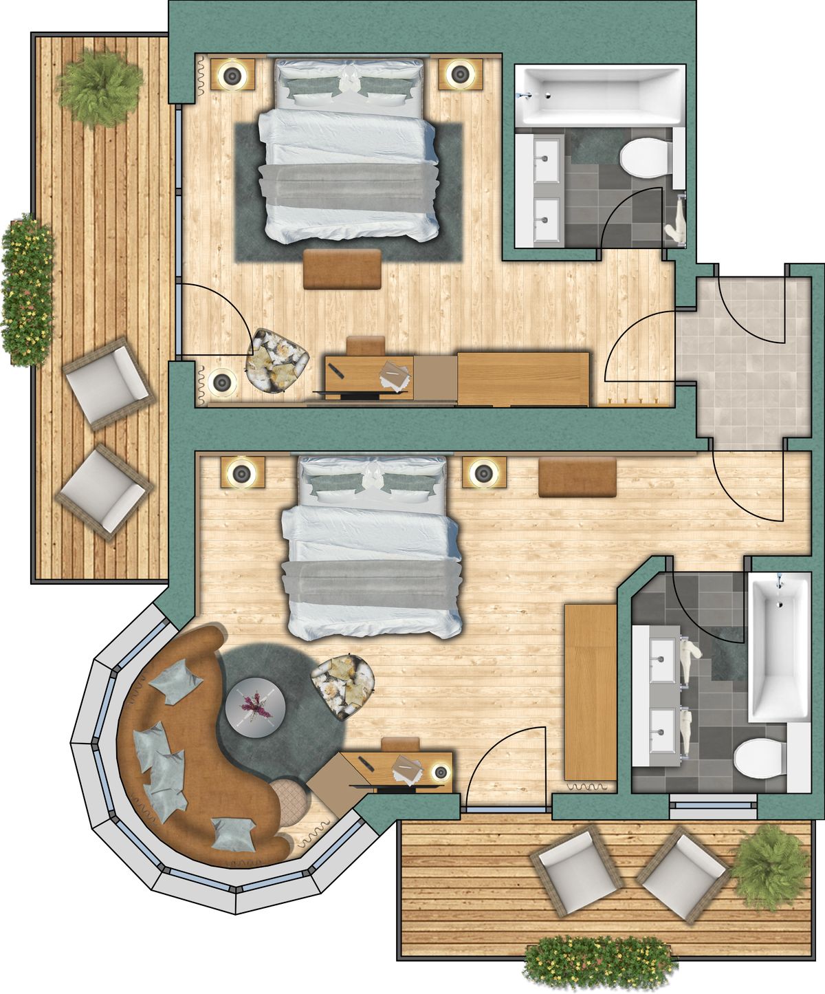 Zwei Zimmer mit Boxspring-Doppelbett mit flauschiger Bettwäsche